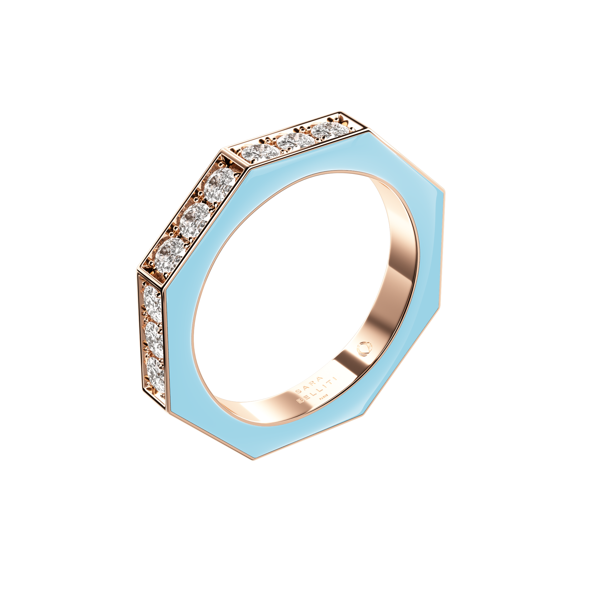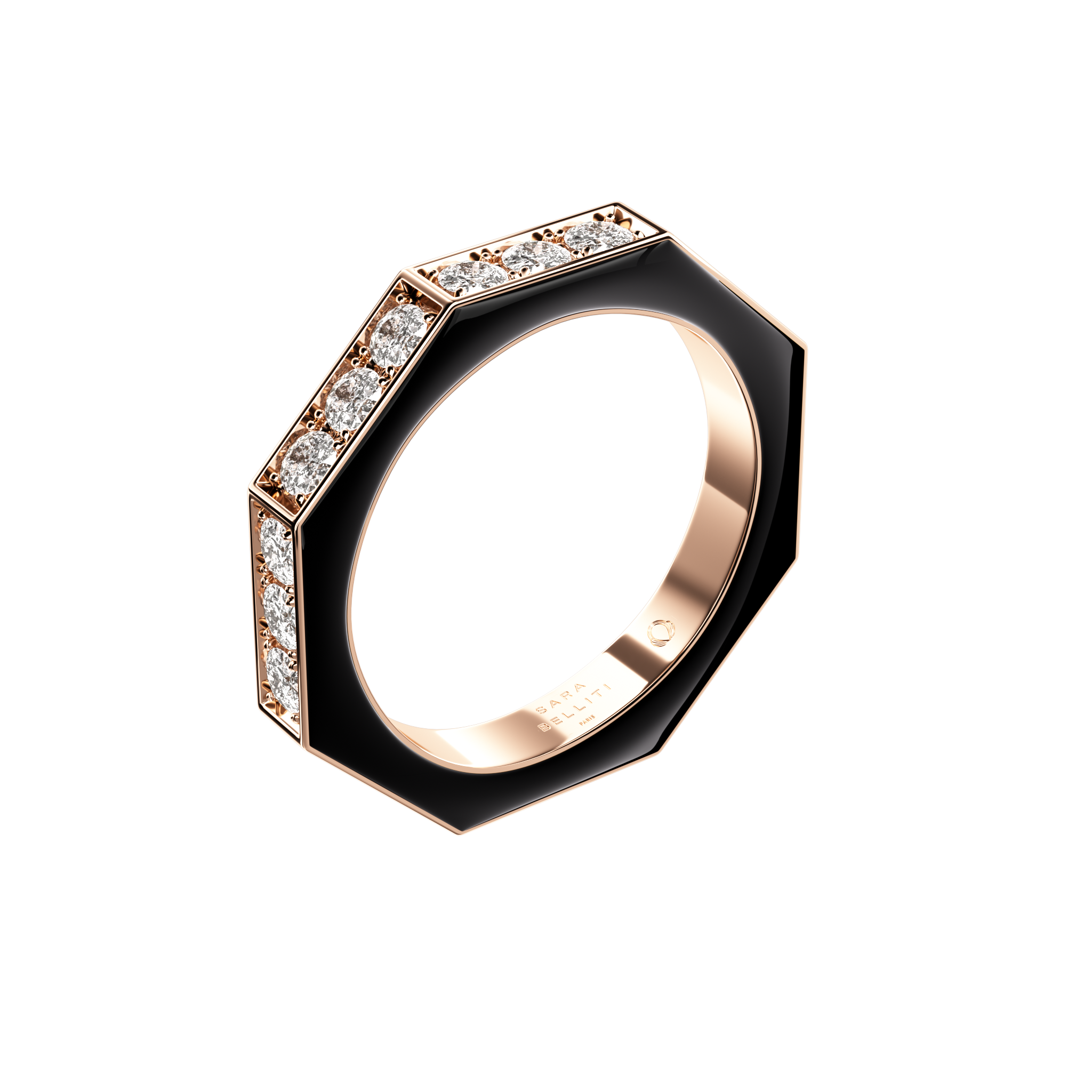 Notre alliance NIDO en or rose 18 carats et ses diamants pavés sur le dessus est fabriquée main. Sublimée par les diamants pavés, elle illumine la main d'un éclat raffiné et incarne une élégance intemporelle. La laque sur les côtés permet une personnalisation et crée une texture lisse sachant capter la lumière.