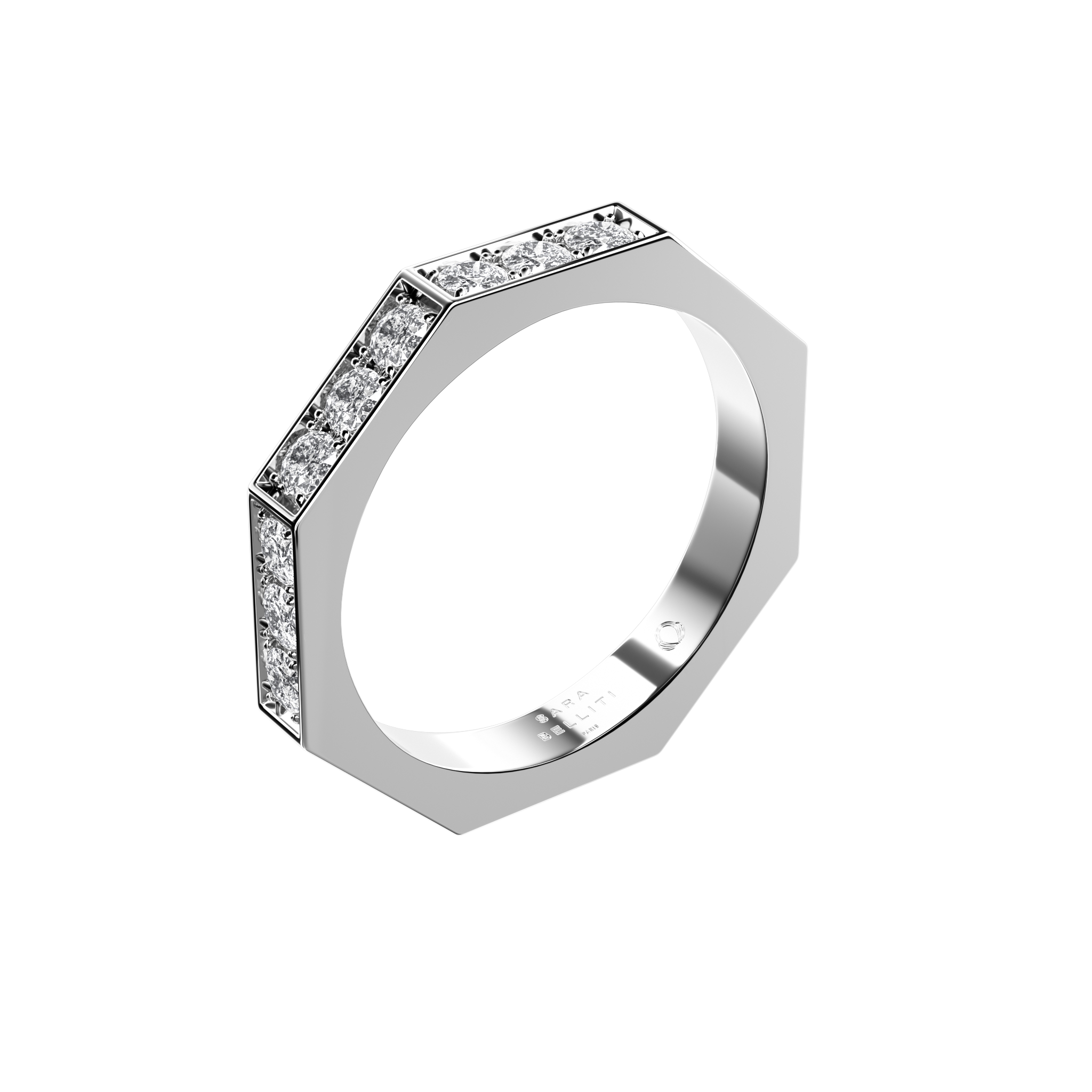 Notre alliance NIDO en or blanc 18 carats, sertie de diamants sur le dessus et délicatement rehaussée d'or sur les côtés, allie raffinement et modernité.
