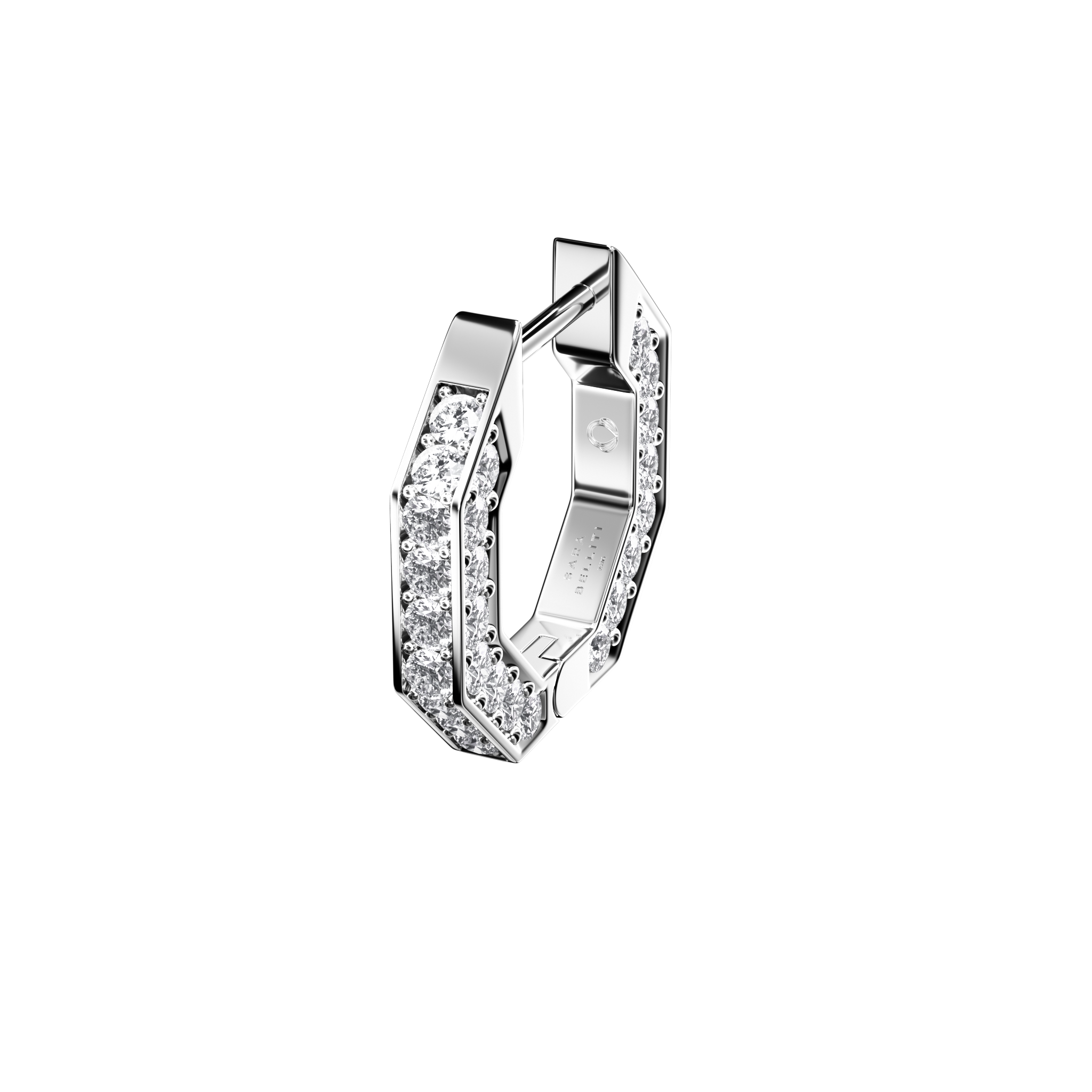 Notre créole NIDO en or blanc 18 carats, entièrement pavée de diamants, est fabriquée main. Les diamants créent un éclat remarquable sous tous les angles.
