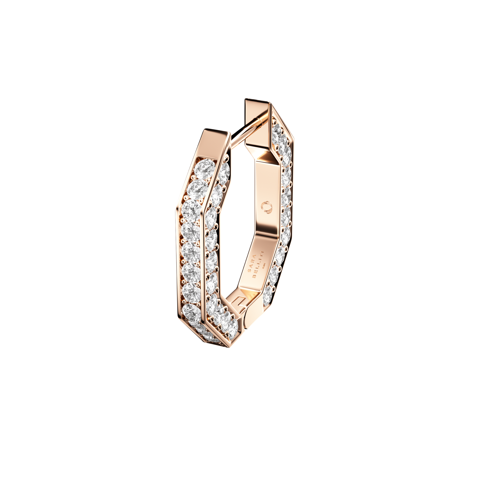 Notre créole NIDO en or rose 18 carats, entièrement pavée de diamants, est fabriquée main. Les diamants créent un éclat remarquable sous tous les angles.