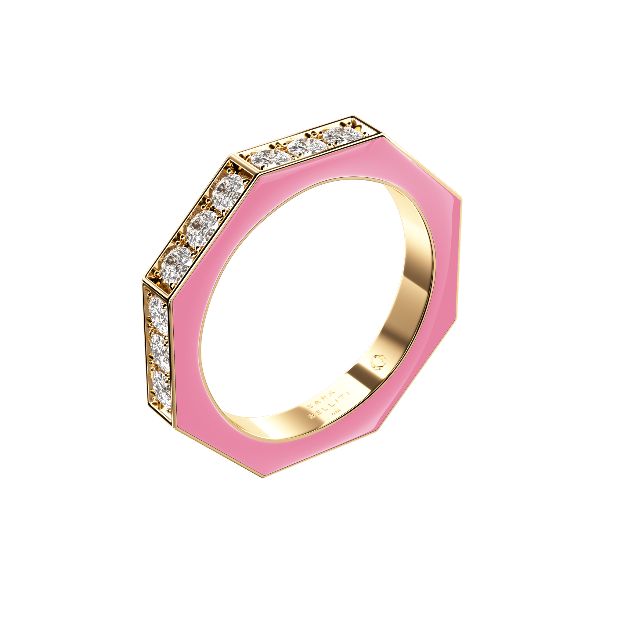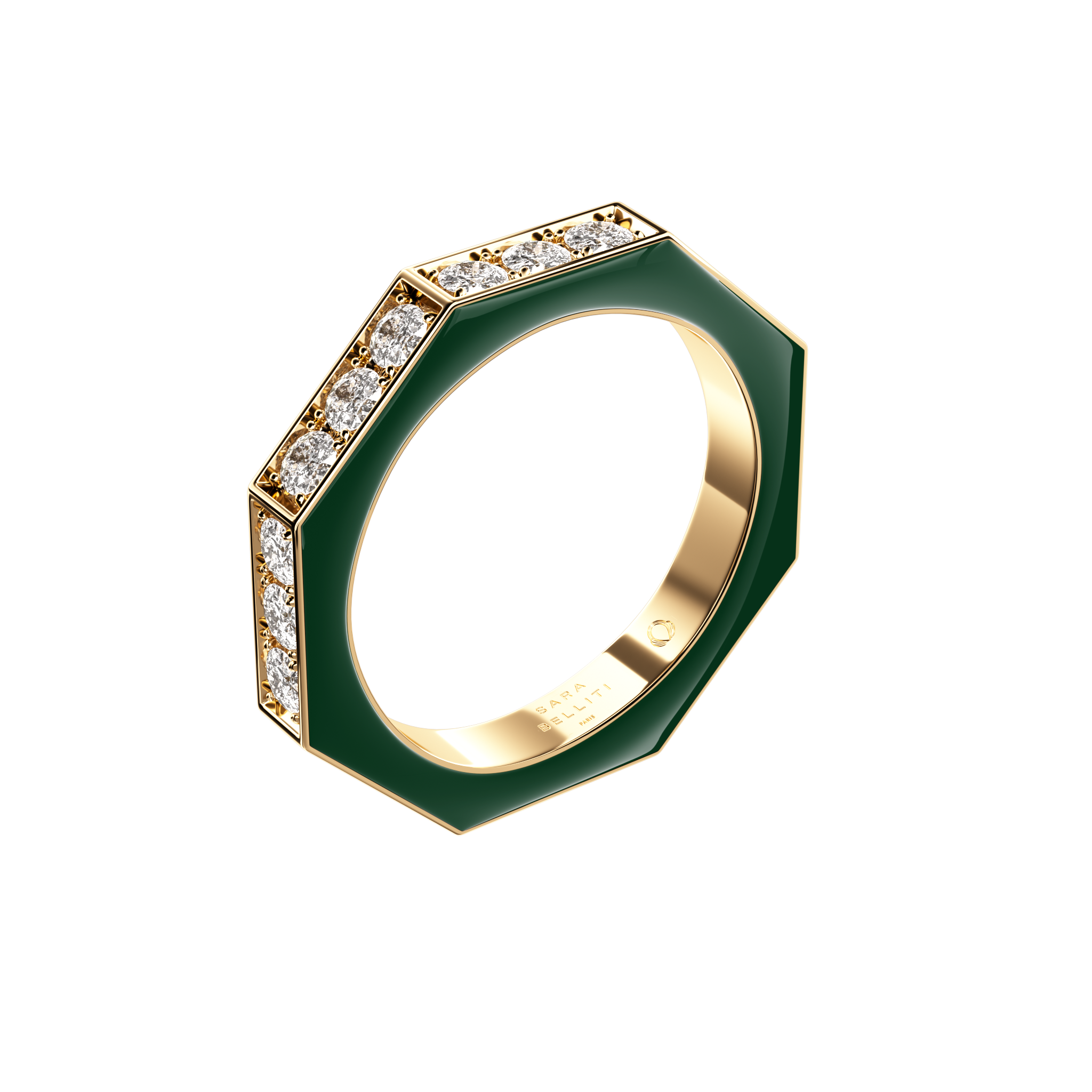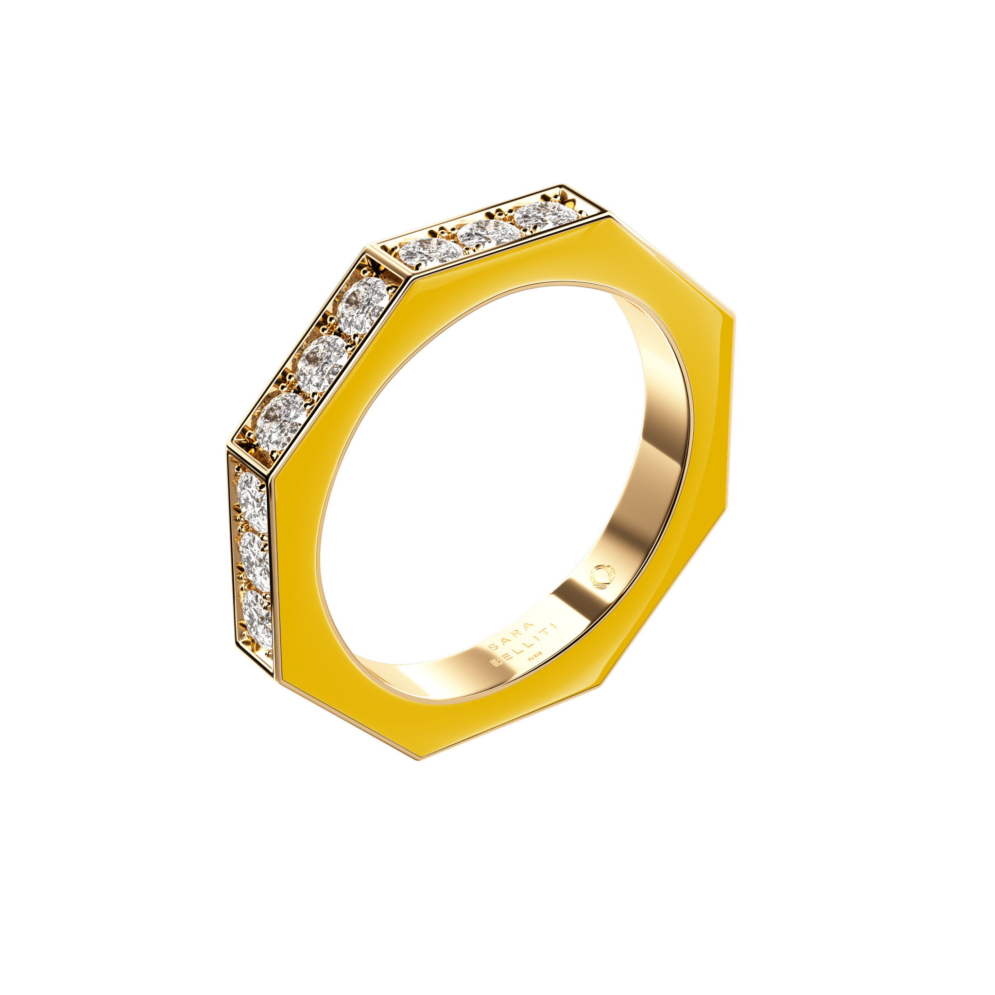 Notre alliance NIDO en or jaune 18 carats et ses diamants pavés sur le dessus est fabriquée main. Sublimée par les diamants pavés, elle illumine la main d'un éclat raffiné et incarne une élégance intemporelle. La laque sur les côtés permet une personnalisation et crée une texture lisse sachant capter la lumière.