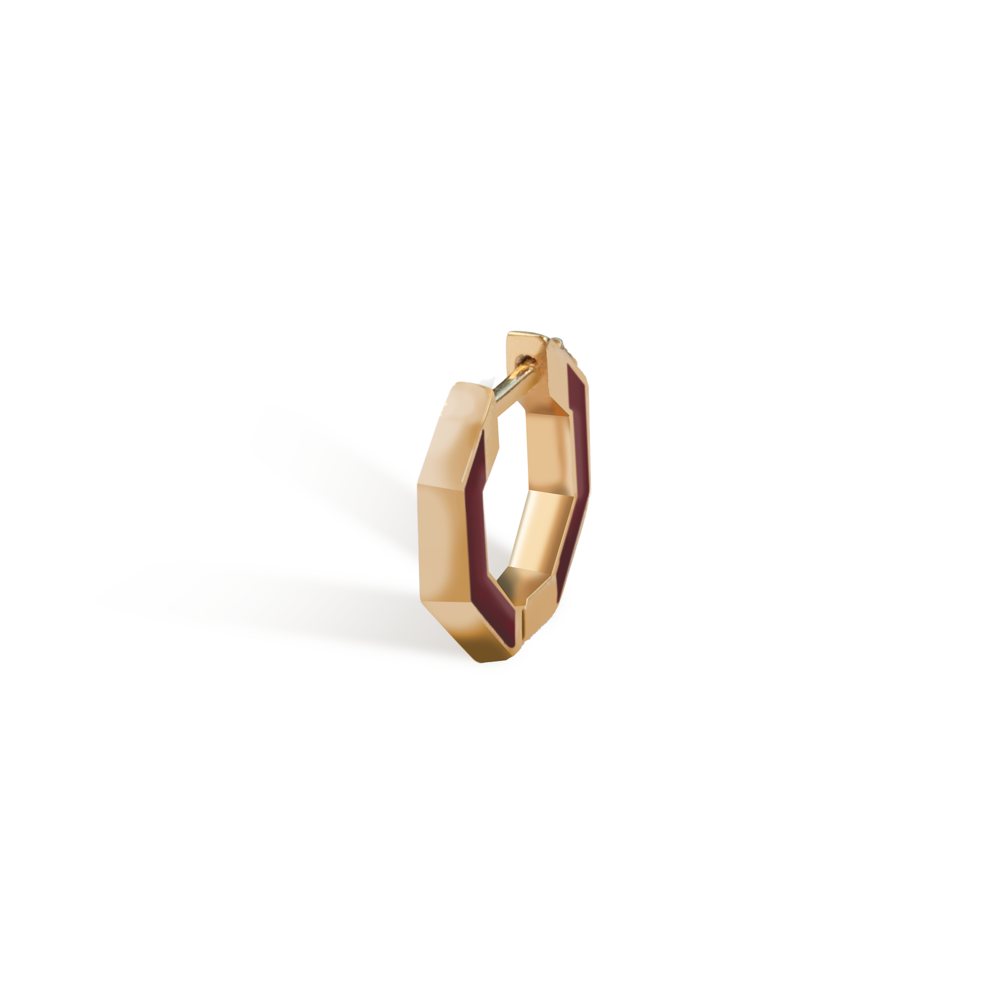 Notre créole NIDO en or jaune 18 carats est fabriquée main. Sa structure permet à la lumière de se refléter sur chaques faces lui donnant un éclat, contrasté par la brillance de la laque.
