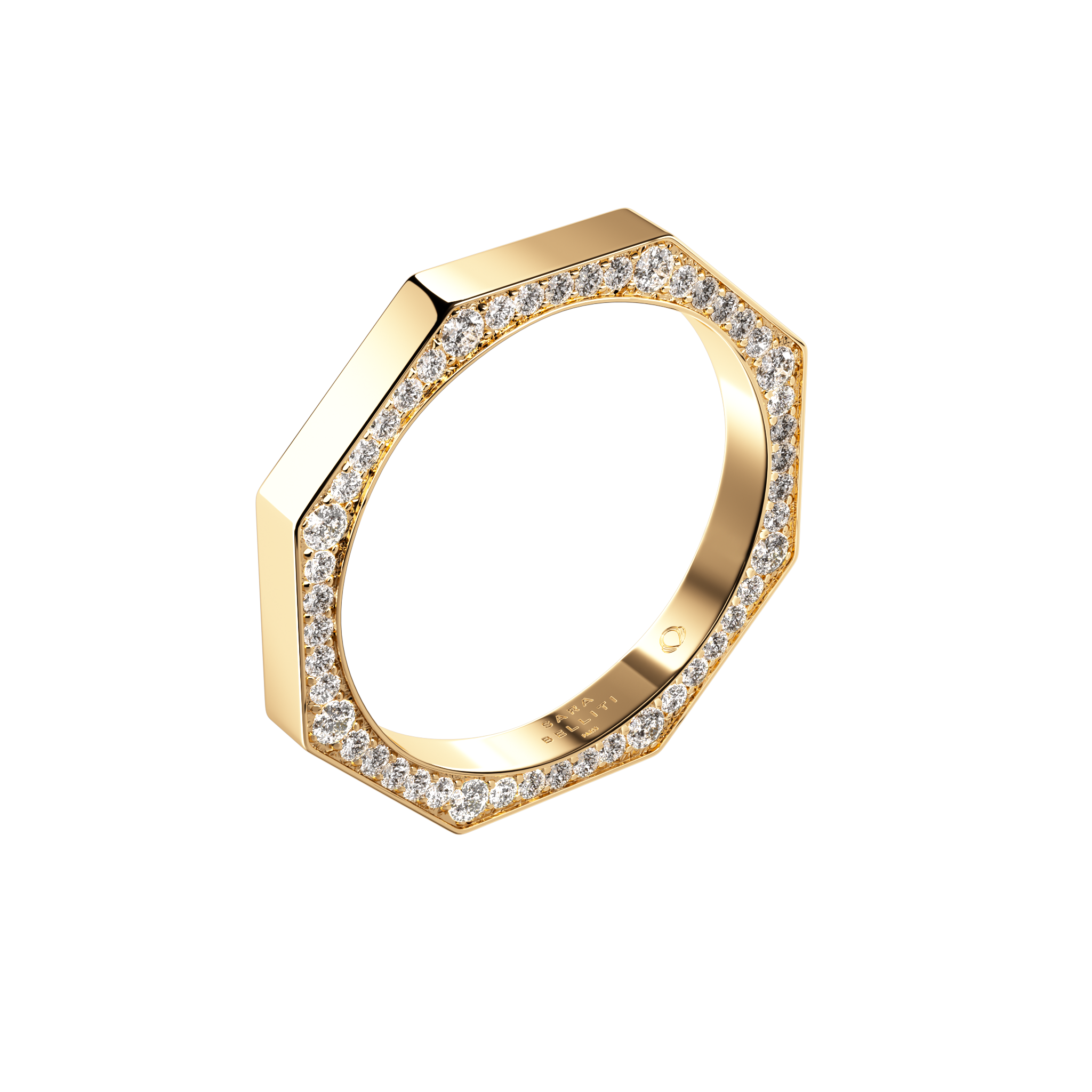 Notre alliance NIDO en or jaune 18 carats, sertie de diamants sur les côtés, est fabriquée à la main. Les diamants, présents sur deux faces du bijou, créent un éclat fascinant sous tous les angles.